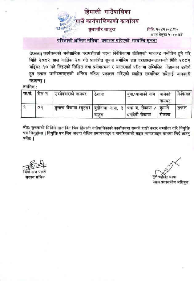 मनोसाजिक परामर्शकर्ता पदको परिक्षाको अन्तिम नतिजा प्रकाशन गरिएको सम्बन्धी सूचना ।