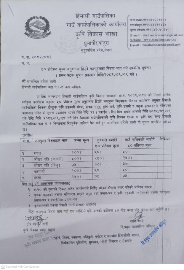५०% मुल्य अनुदानमा हिउदे फलफुलका विरुवा माग गर्ने सम्बन्धि सूचना ।