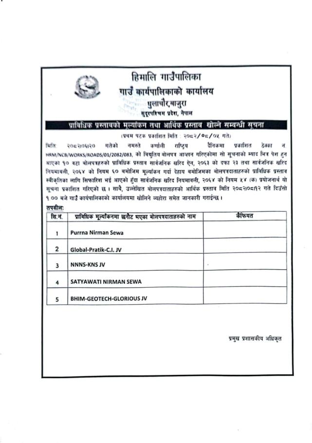 » प्राविधिक प्रस्तावको मुल्याँकन तथा आर्थिक प्रस्ताव खोल्ने सम्बन्धी सूचना ।